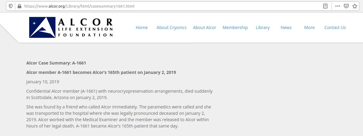 Confidential Alcor member (A-1661) with neurocryopreservation arrangements, died suddenly in Scottsdale, Arizona on January 2, 2019.